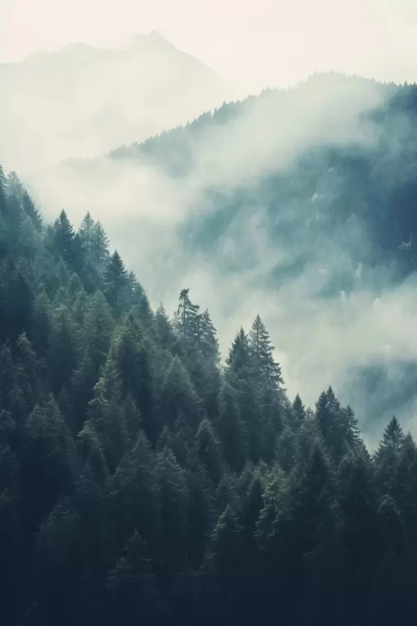 Poster Creaste de munte cețoase și pădure întunecată de conifere Nr f46518
