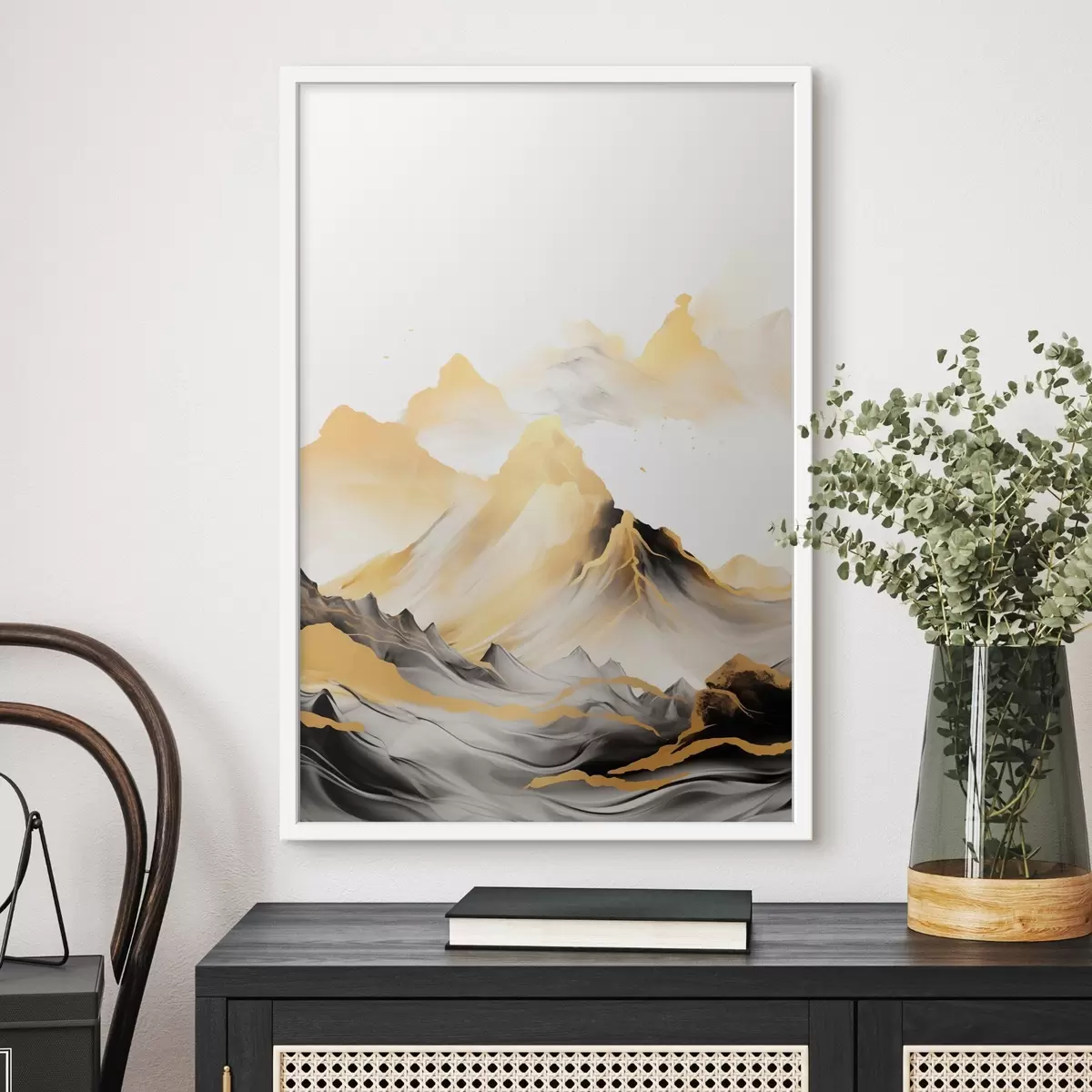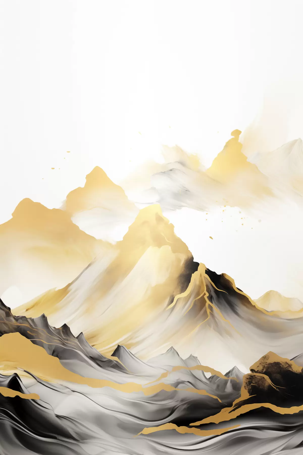 Poster Munți texturați galbeni și negri cu vârfuri înzăpezite, stil de pictură cu tuș, lanț muntos minimalist Nr f46684
