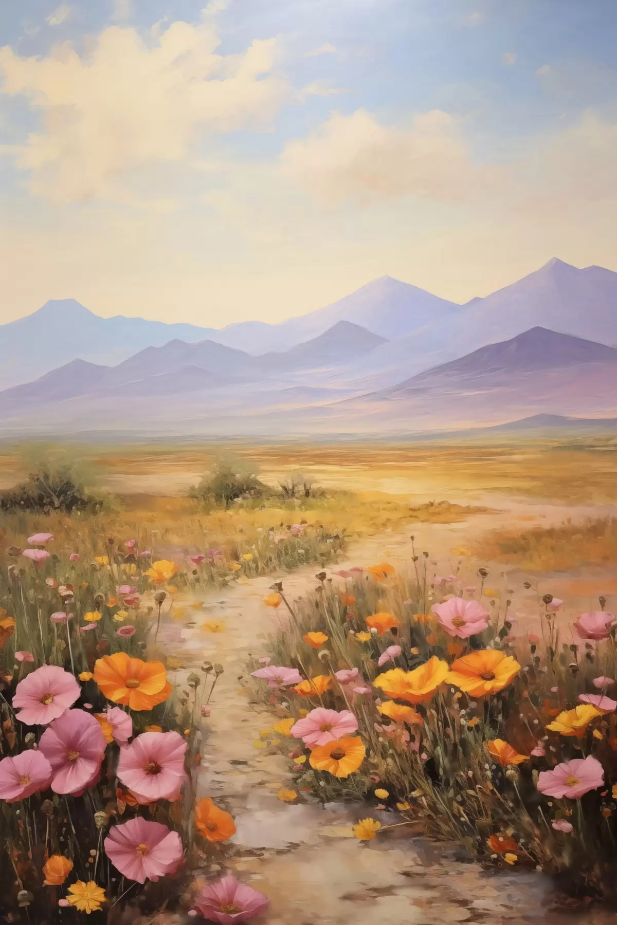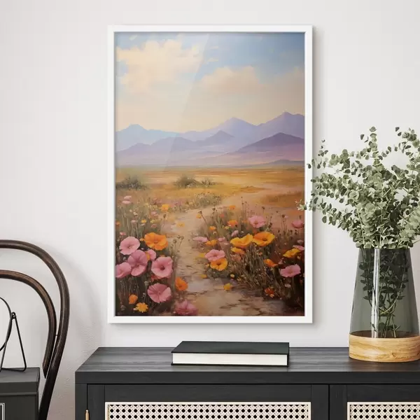 Poster Peisaj, un câmp cu flori colorate și munți în fundal, culori delicate și pastelate Nr f46686