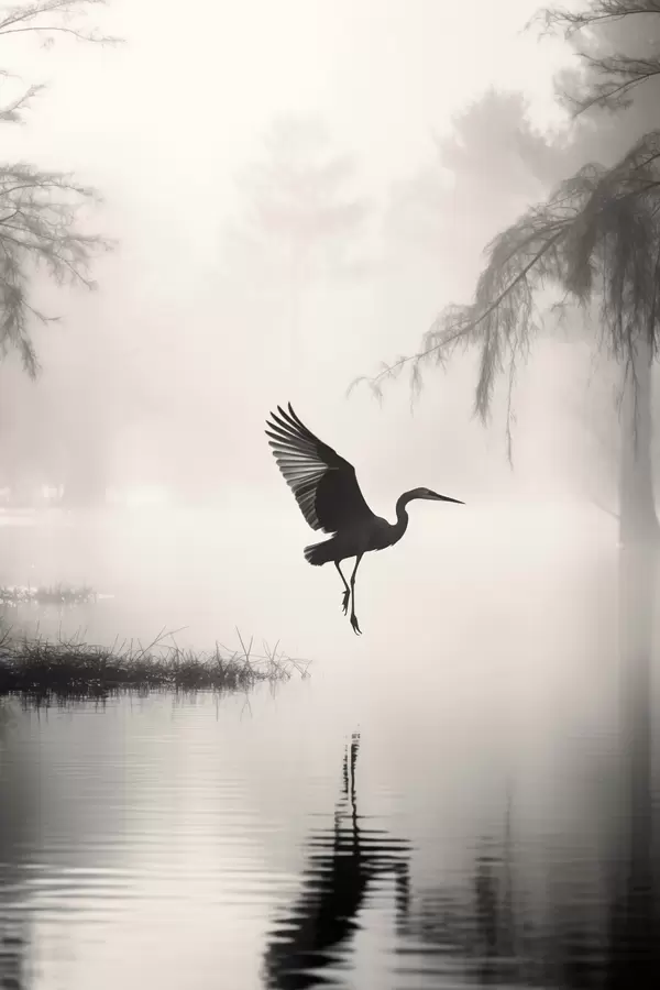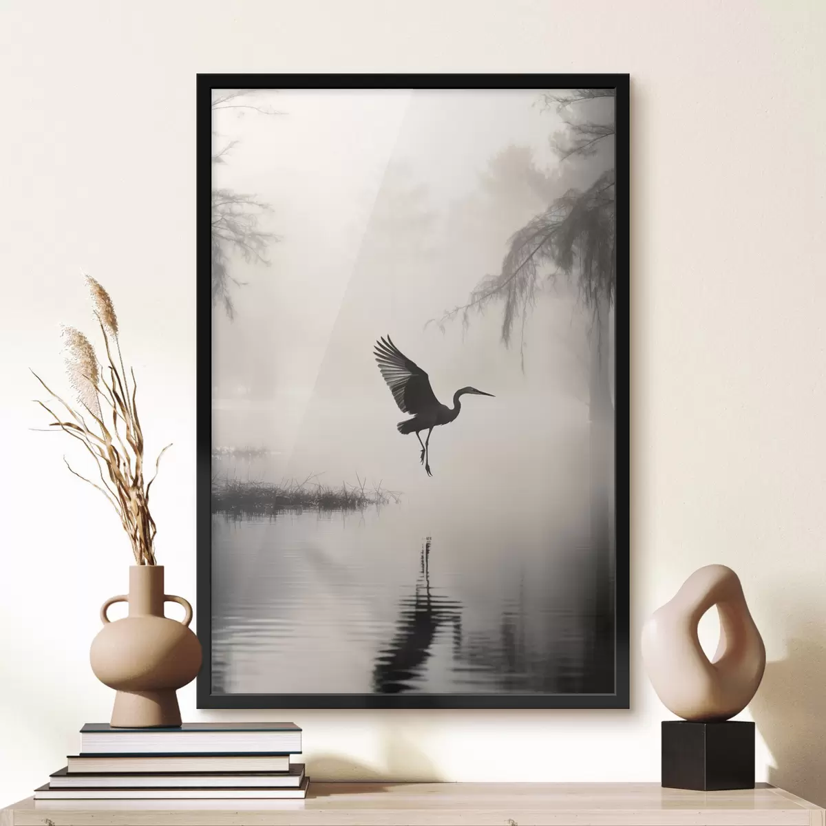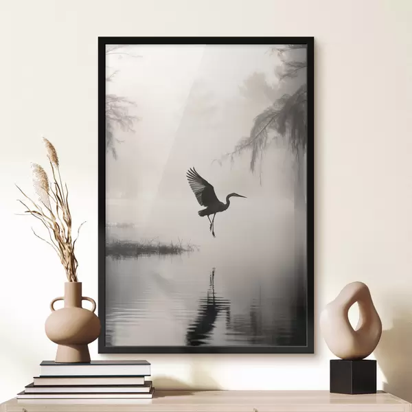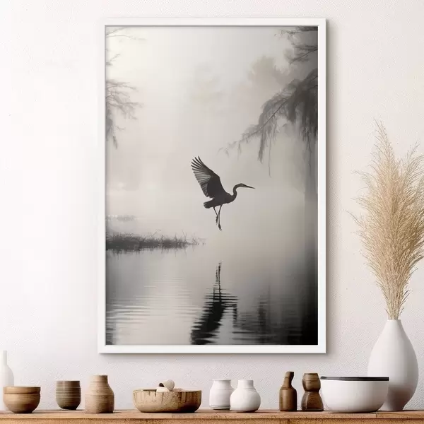 Poster O stârcă albă cu aripile întinse, zburând lângă stufărișuri înalte, compoziție minimalistă în alb și negru Nr f46694