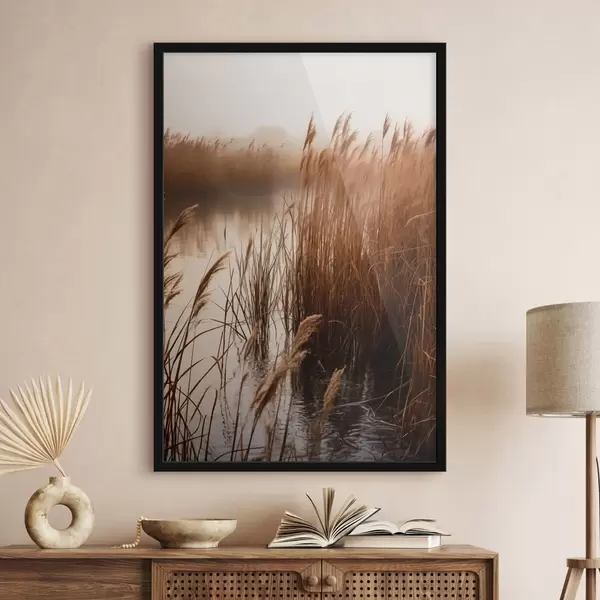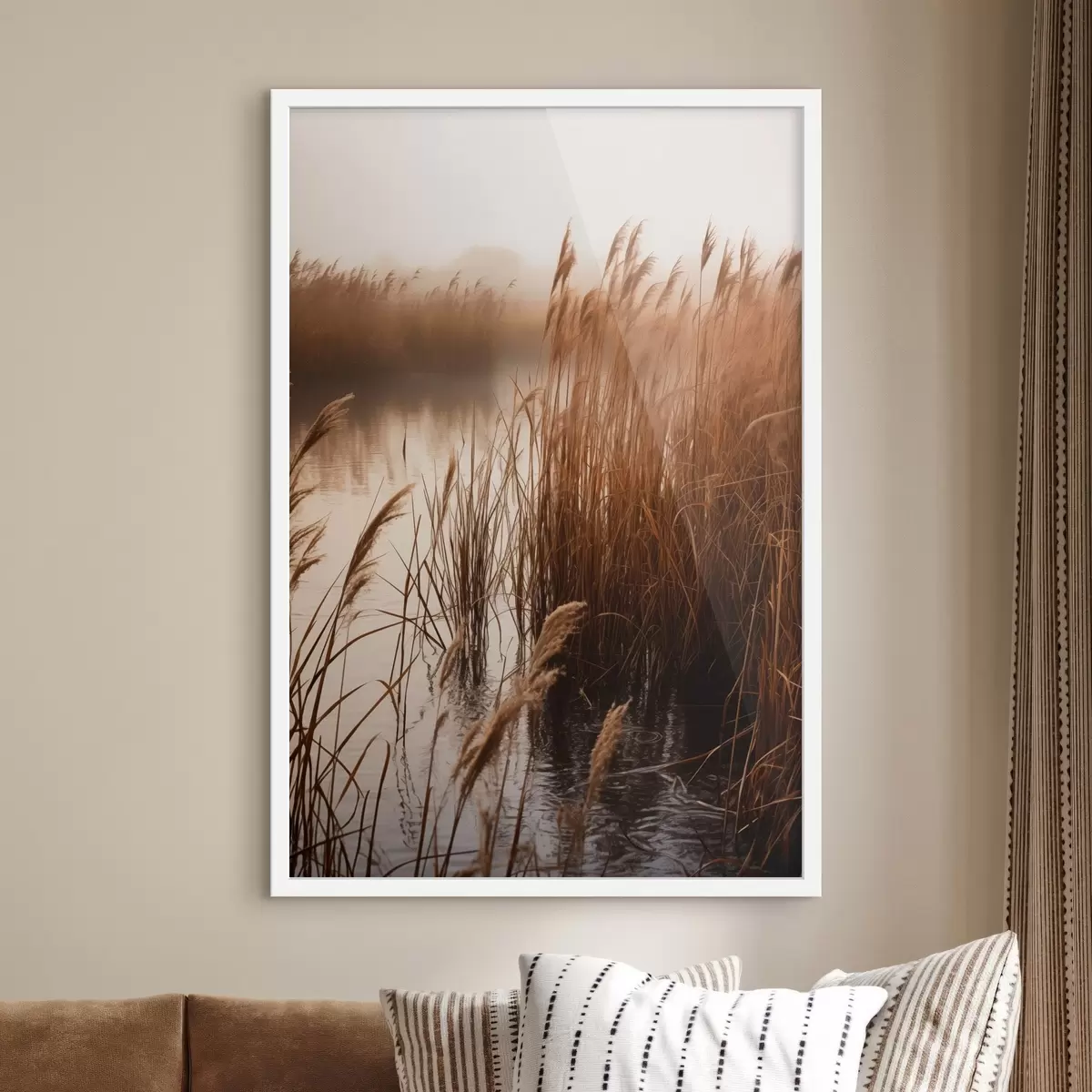 Poster Stuf înalt crescând într-un corp de apă, apa reflectă stuful, fundal cețos, lumină difuză, peisaj natural Nr f46695