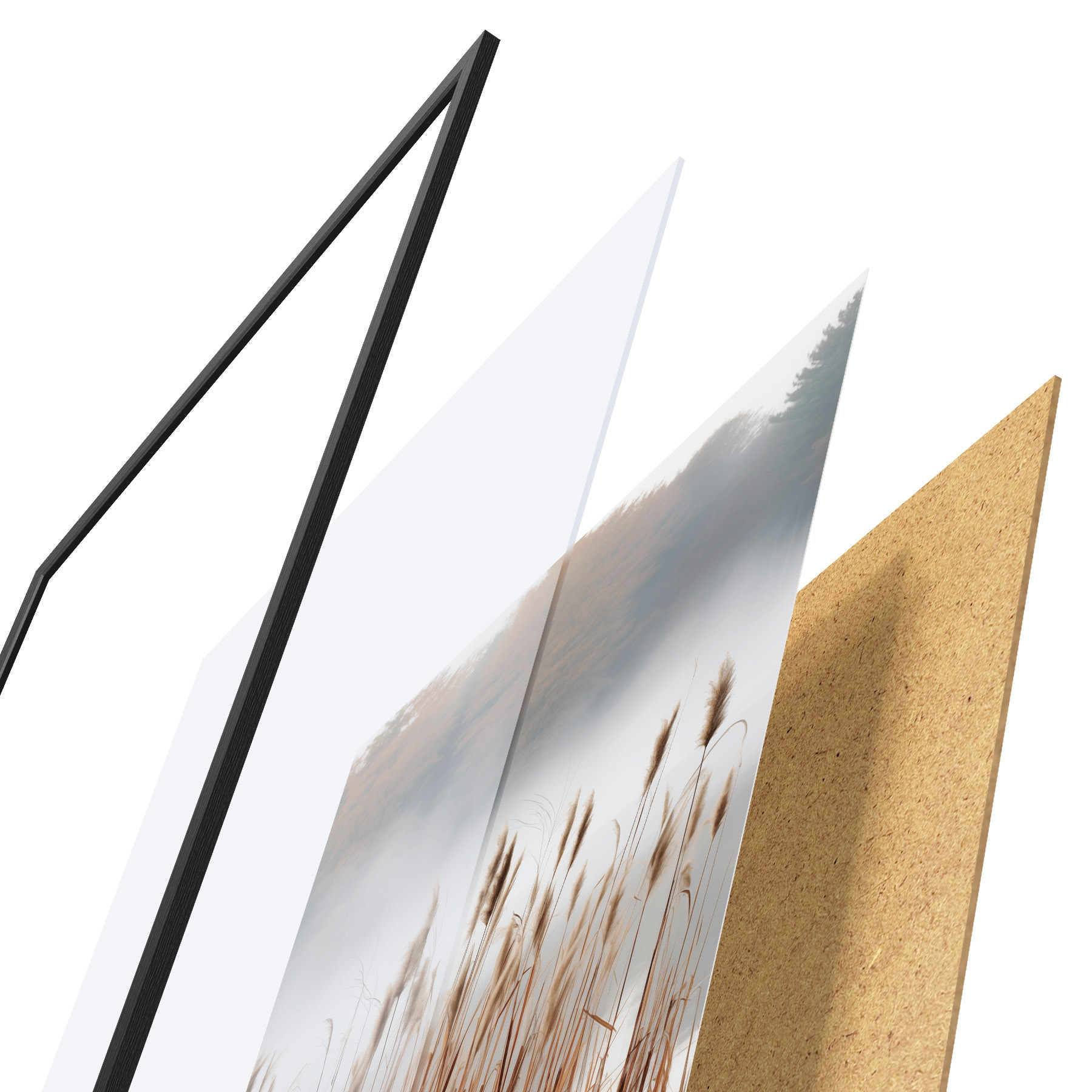 Poster Stuf înalt crescând într-un corp de apă, apa reflectă stuful, fundal cețos, lumină difuză, peisaj natural Nr f46696