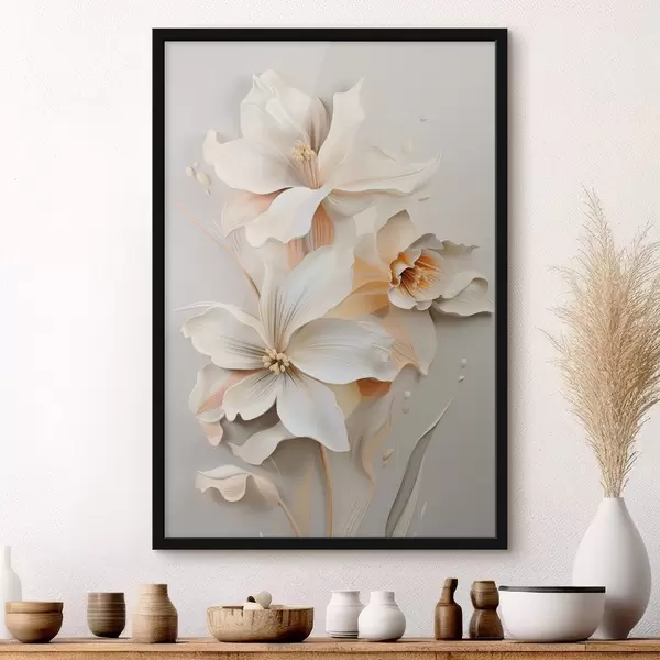 Poster Flori albe, petale cu umbre delicate, fundal bej deschis, compoziție elegantă, stil minimalist f46699