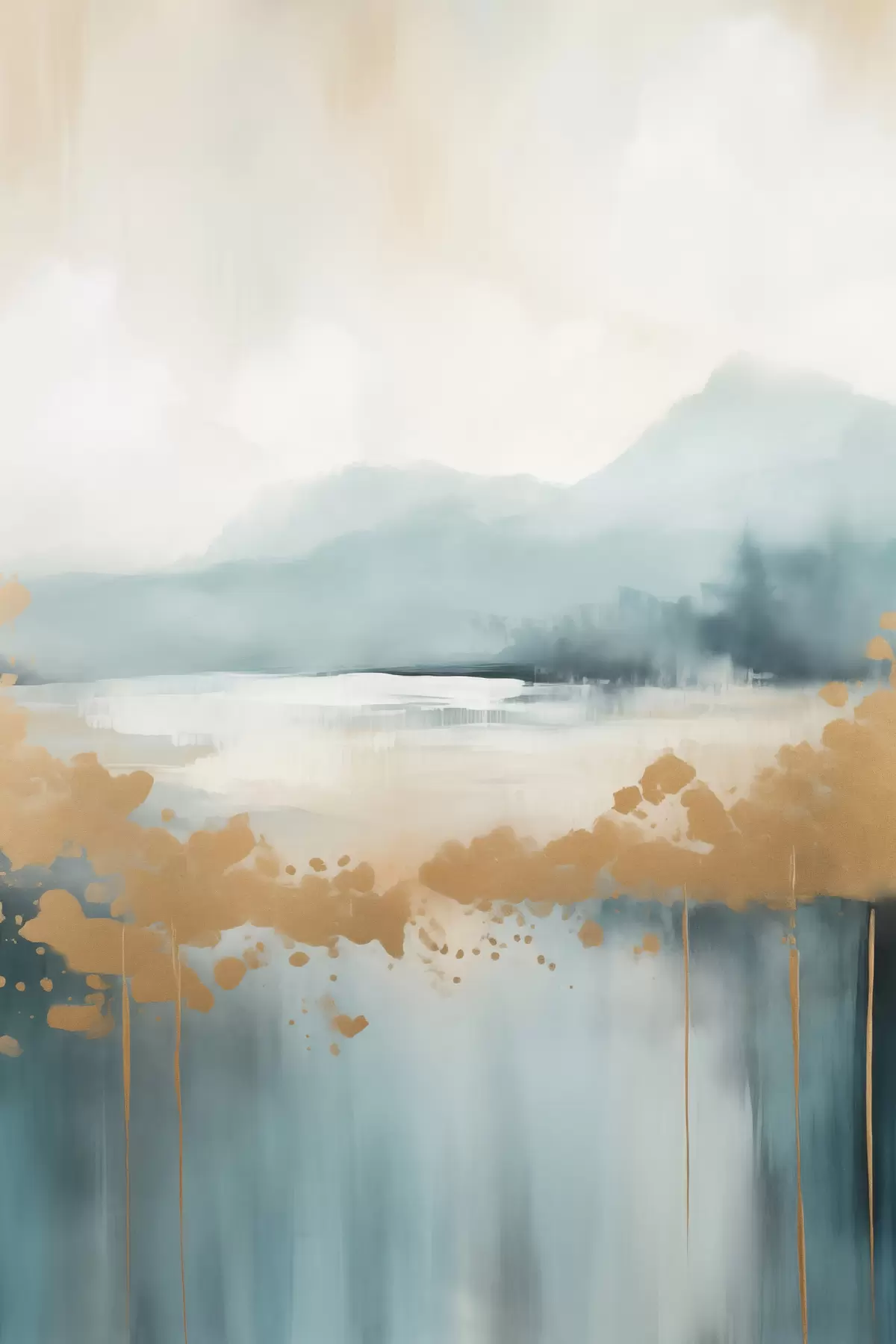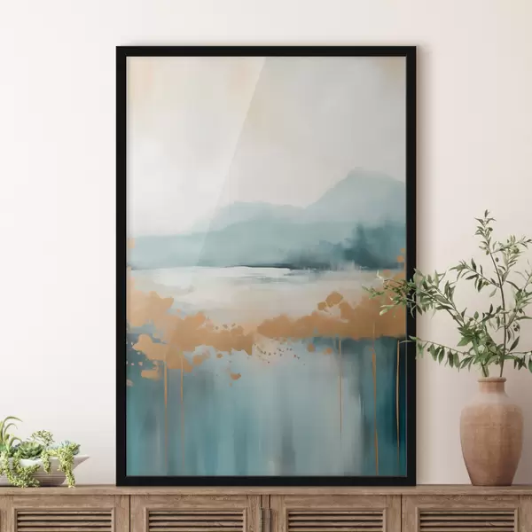 Poster Peisaj abstract cu munți și lac în nuanțe de verde-albastru și galben texturat, pensule moi, operă de artă minimalistă Nr f46703