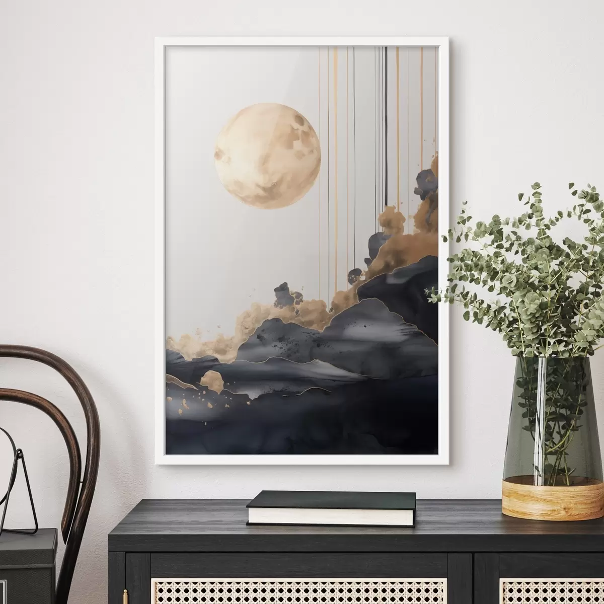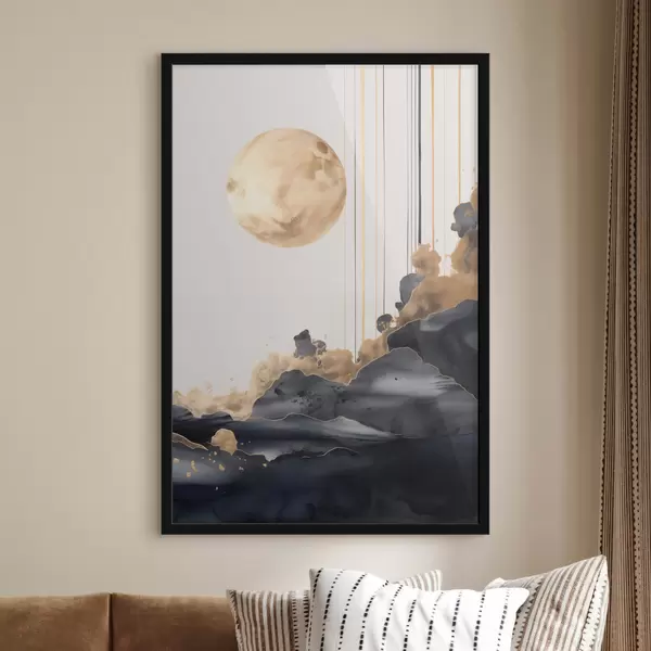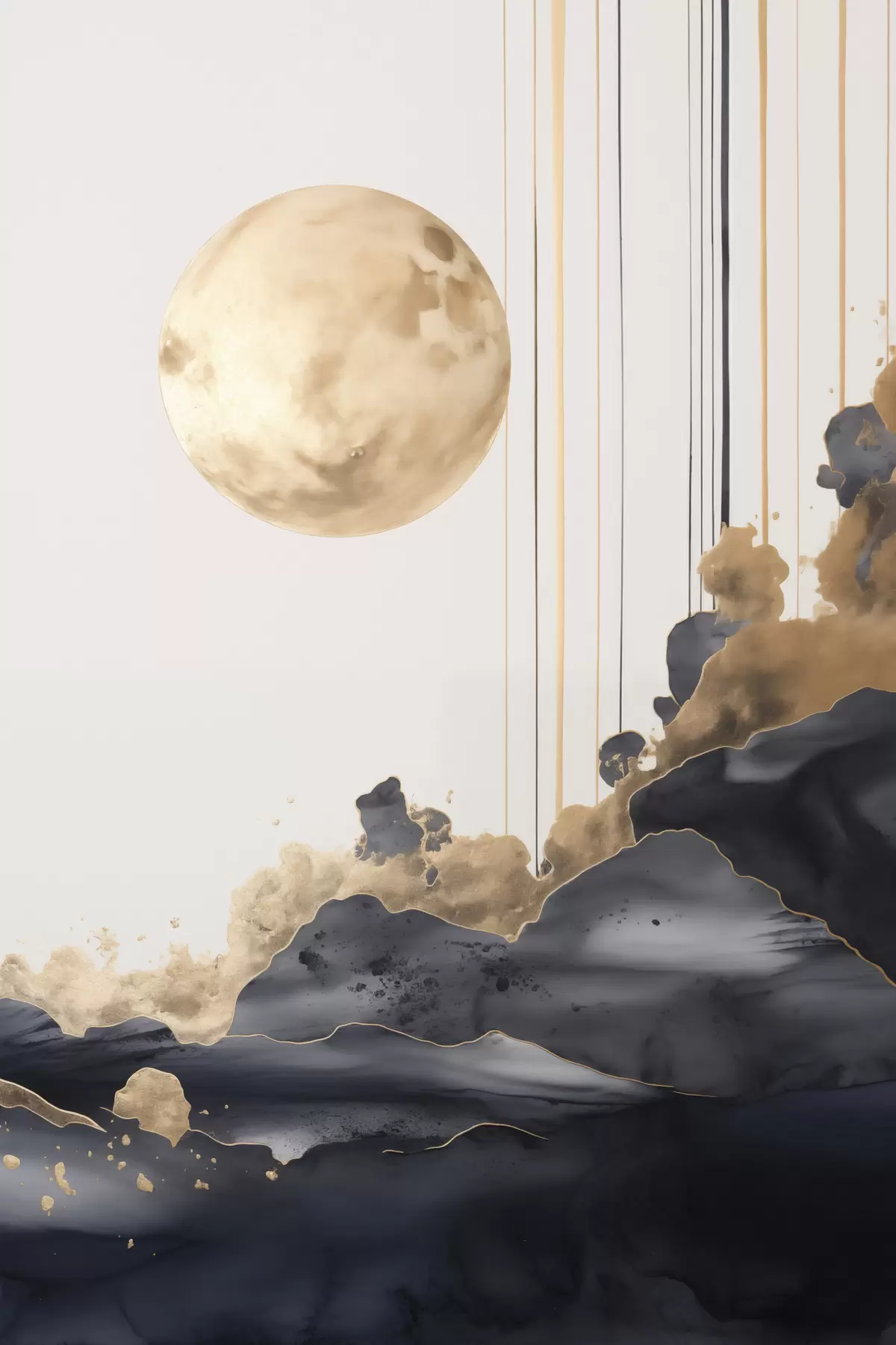 Poster Lună plină cu nori negri și galbeni texturați, linii verticale, stil abstract, minimalist și modern Nr f46707