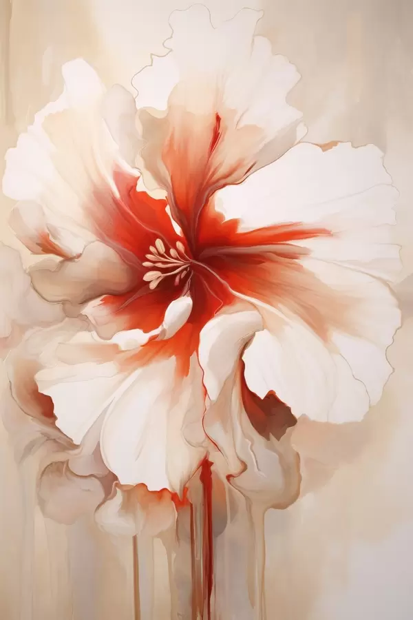 Poster Prim-plan al unei flori albe și roșii cu petale semitransparente și picături de vopsea care curg Nr f46941