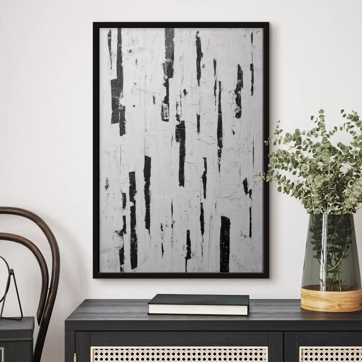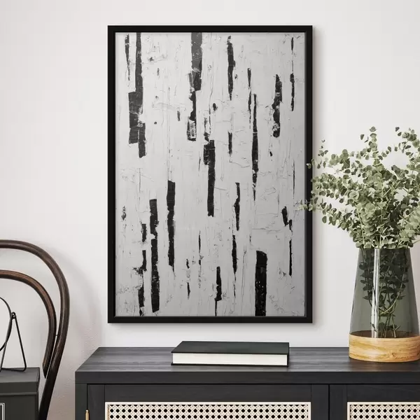 Poster Compoziție abstractă cu tușe verticale negre pe fond alb, în stil pictură în ulei f46956