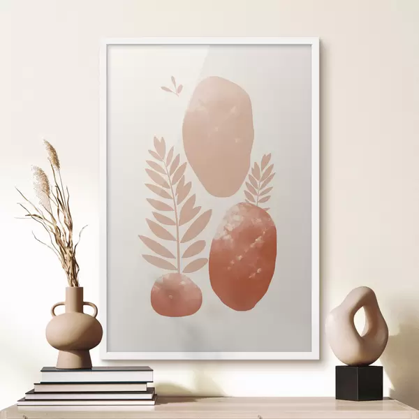 Poster Forme abstracte, pietre texturate și frunze în nuanțe discrete de piersică și teracotă, fundal minimalist, crem f47012