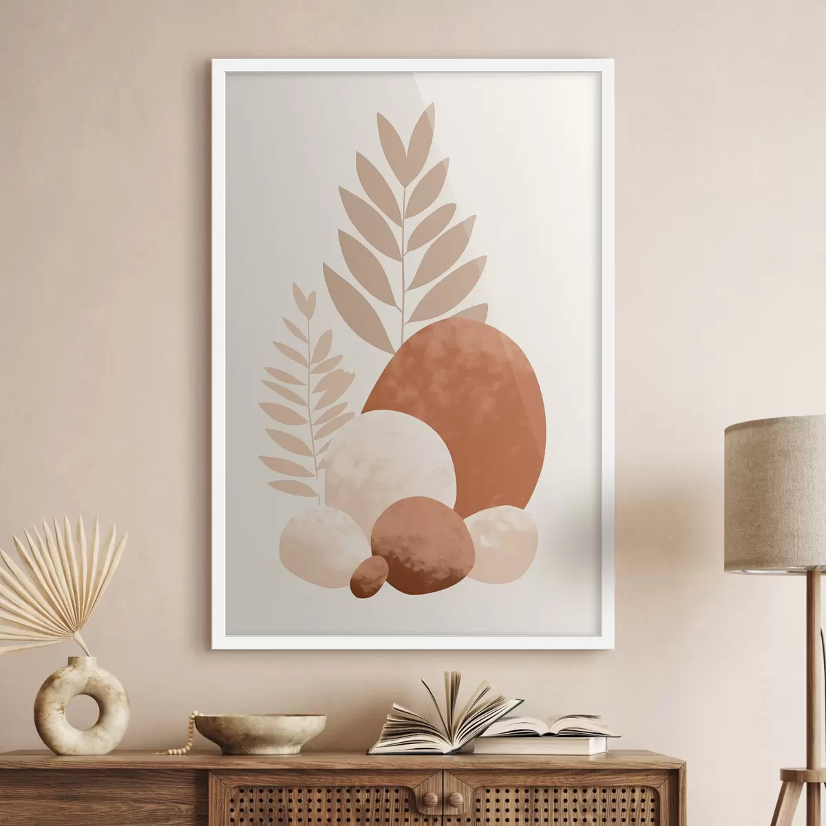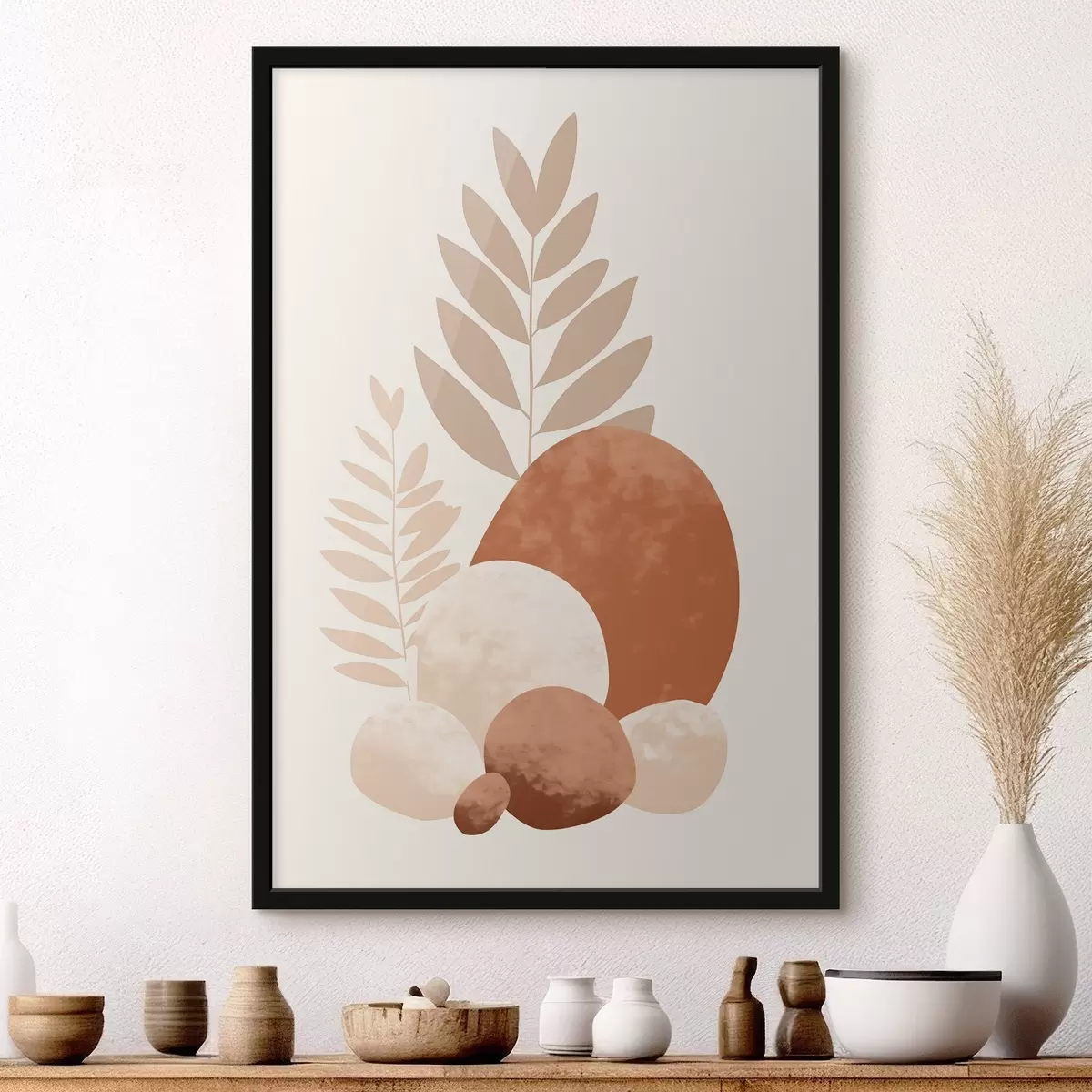 Poster Forme abstracte, pietre texturate și frunze în nuanțe discrete de piersică și teracotă, fundal minimalist, crem Nr f47013