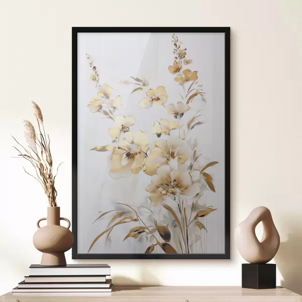 Poster Flori și frunze galbene texturate pe fond alb, cu tușe delicate Nr f47016
