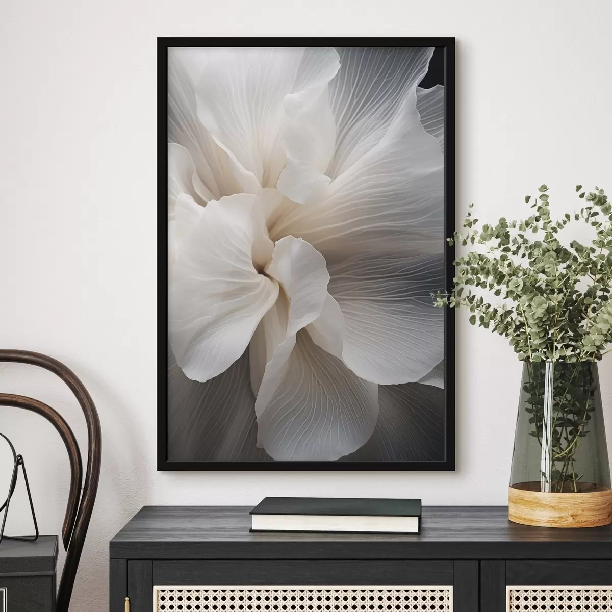 Poster Prim-plan cu petale florale albe abstracte delicate, cu linii complexe și un fundal întunecat estompat f47018