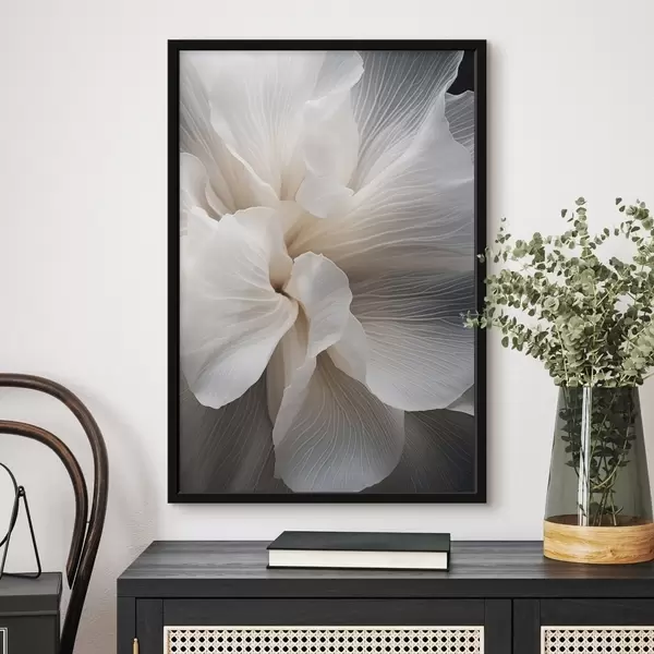 Poster Prim-plan cu petale florale albe abstracte delicate, cu linii complexe și un fundal întunecat estompat Nr f47018
