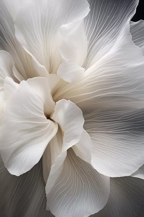 Poster Prim-plan cu petale florale albe abstracte delicate, cu linii complexe și un fundal întunecat estompat f47018