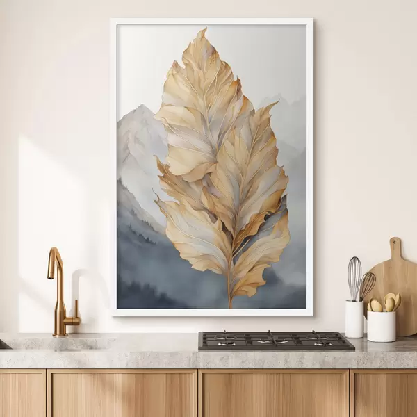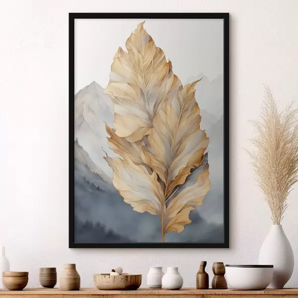 Poster Frunze abstracte mari, galbene și maronii, cu detalii complexe, pe fundalul unui peisaj montan Nr f47022