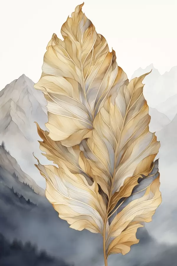 Poster Frunze abstracte mari, galbene și maronii, cu detalii complexe, pe fundalul unui peisaj montan Nr f47022