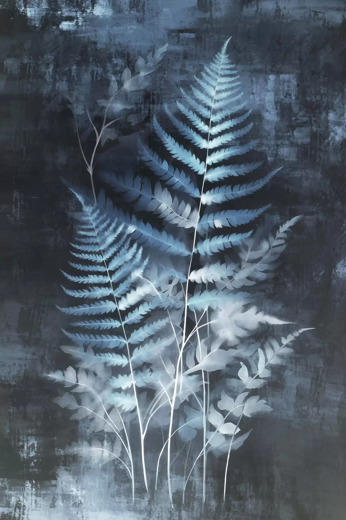Poster Ferigi și plante albastre pe un fundal întunecat, texturat, cu accent pe detaliile complexe, efect de raze X Nr f47026