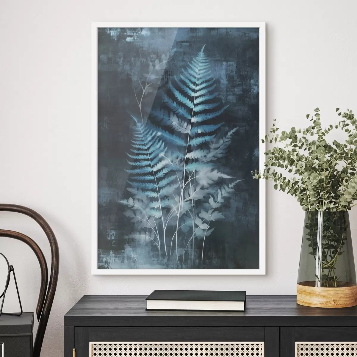 Poster Ferigi și plante albastre pe un fundal întunecat, texturat, cu accent pe detaliile complexe, efect de raze X f47026