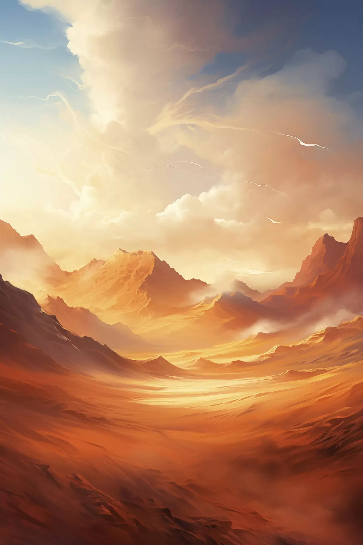 Poster Un peisaj vast, deșertic, de culoare portocalie, cu munți stâncoși falnici, sub un cer încețoșat, luminat de soare, cu nori subțiri. f47028