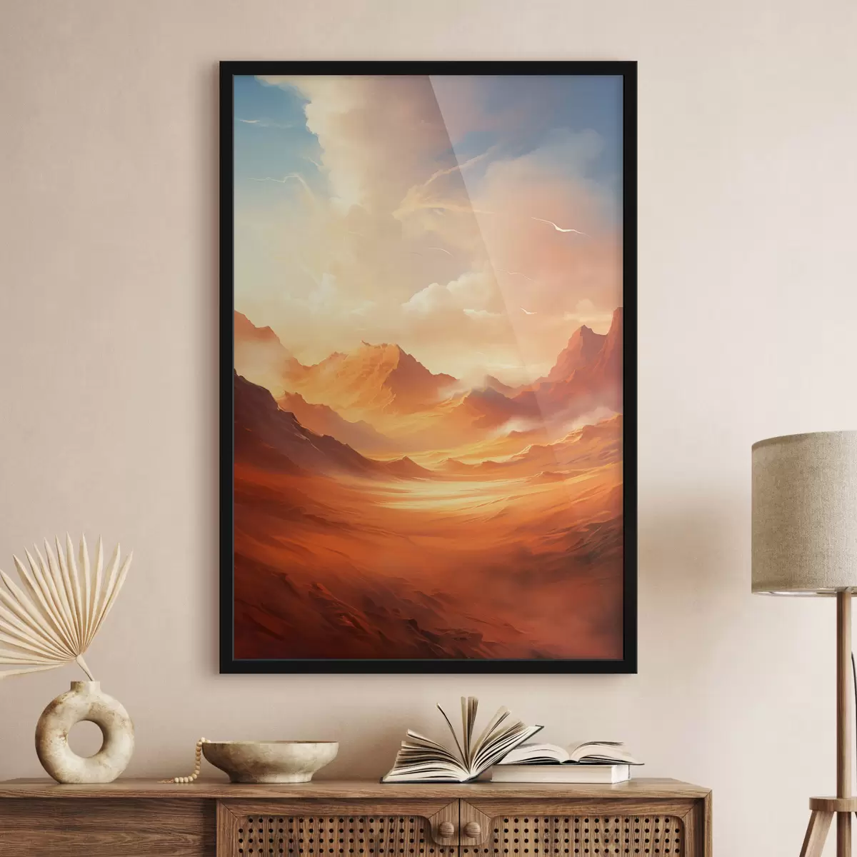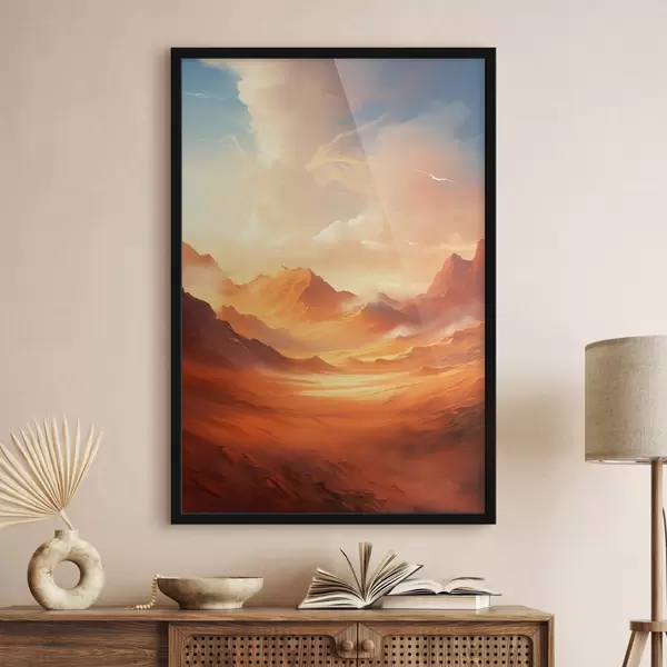 Poster Un peisaj vast, deșertic, de culoare portocalie, cu munți stâncoși falnici, sub un cer încețoșat, luminat de soare, cu nori subțiri. Nr f47028
