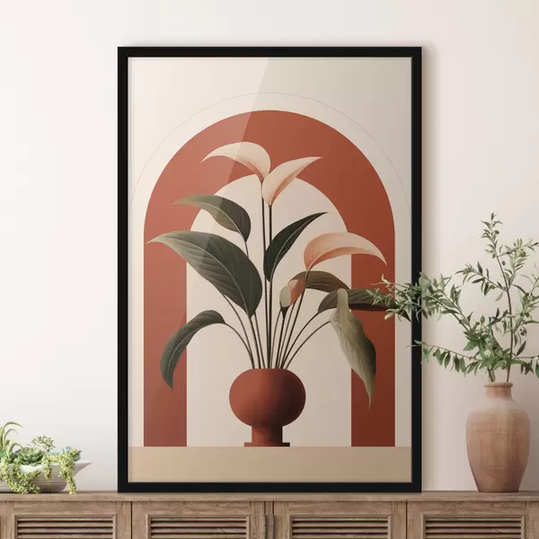 Poster Plantă abstractă în ghiveci, cu frunze mari verzi și bej, în fața unei arcade de culoare crem, cu accente de teracotă. Nr f47032