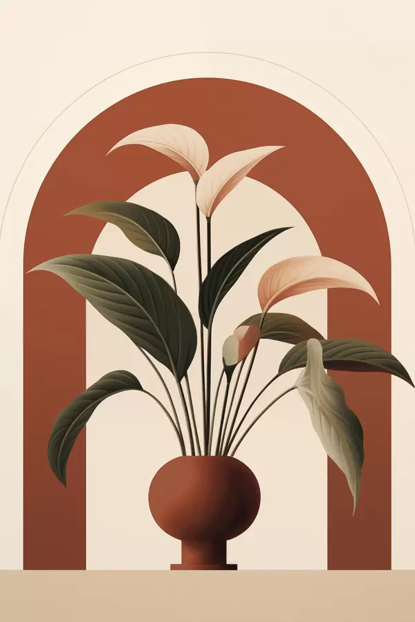 Poster Plantă abstractă în ghiveci, cu frunze mari verzi și bej, în fața unei arcade de culoare crem, cu accente de teracotă f47032