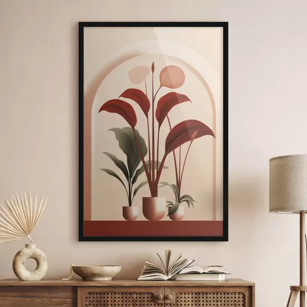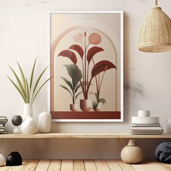 Poster Plante abstracte în ghivece, cu frunze mari verzi și roșii, în fața unei arcade de culoare crem. Nr f47033