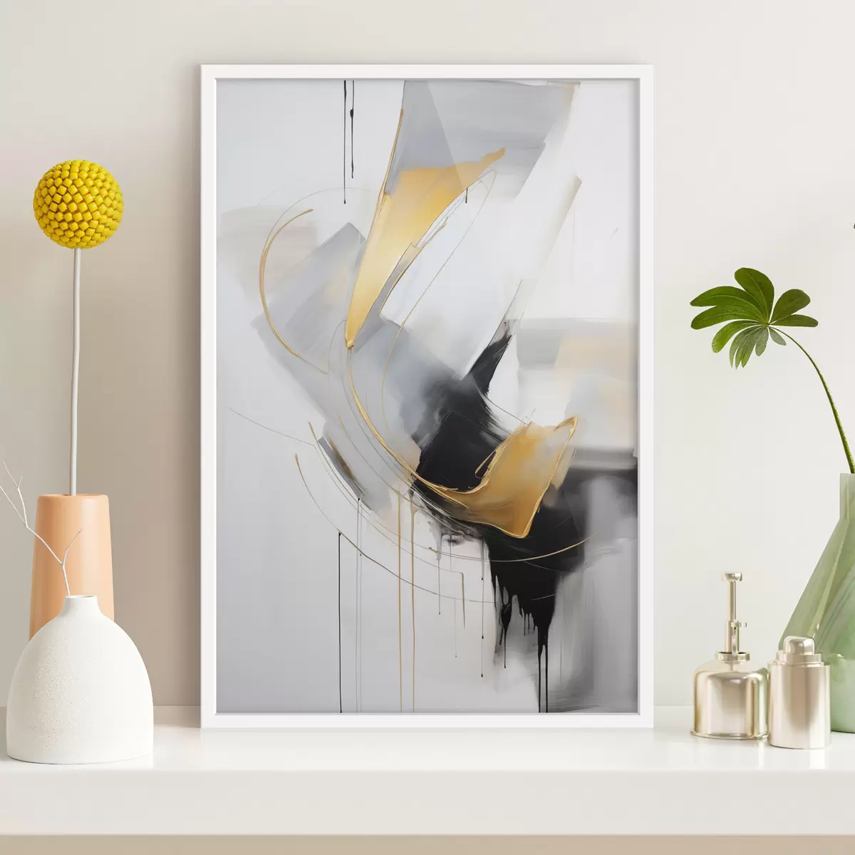 Poster Pictură abstractă cu imitații de pensule galbene, negre și albe, linii dinamice f47034
