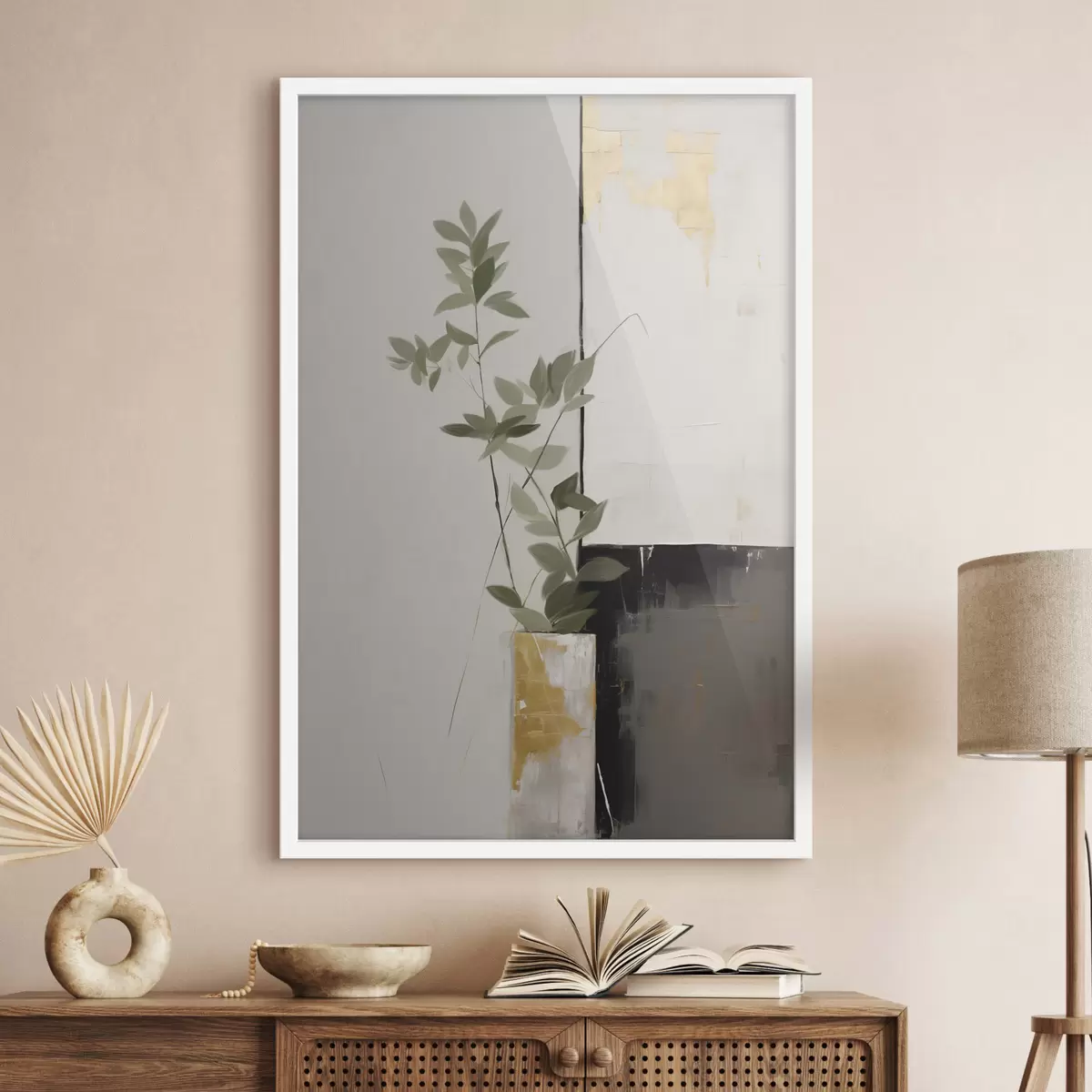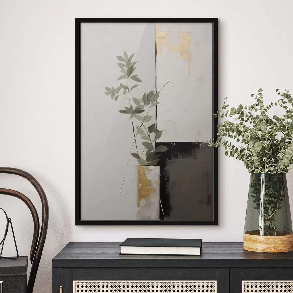 Poster O pictură minimalistă texturată reprezentând un vas cu frunze verzi pe un fundal de forme geometrice abstracte. Nr f47036