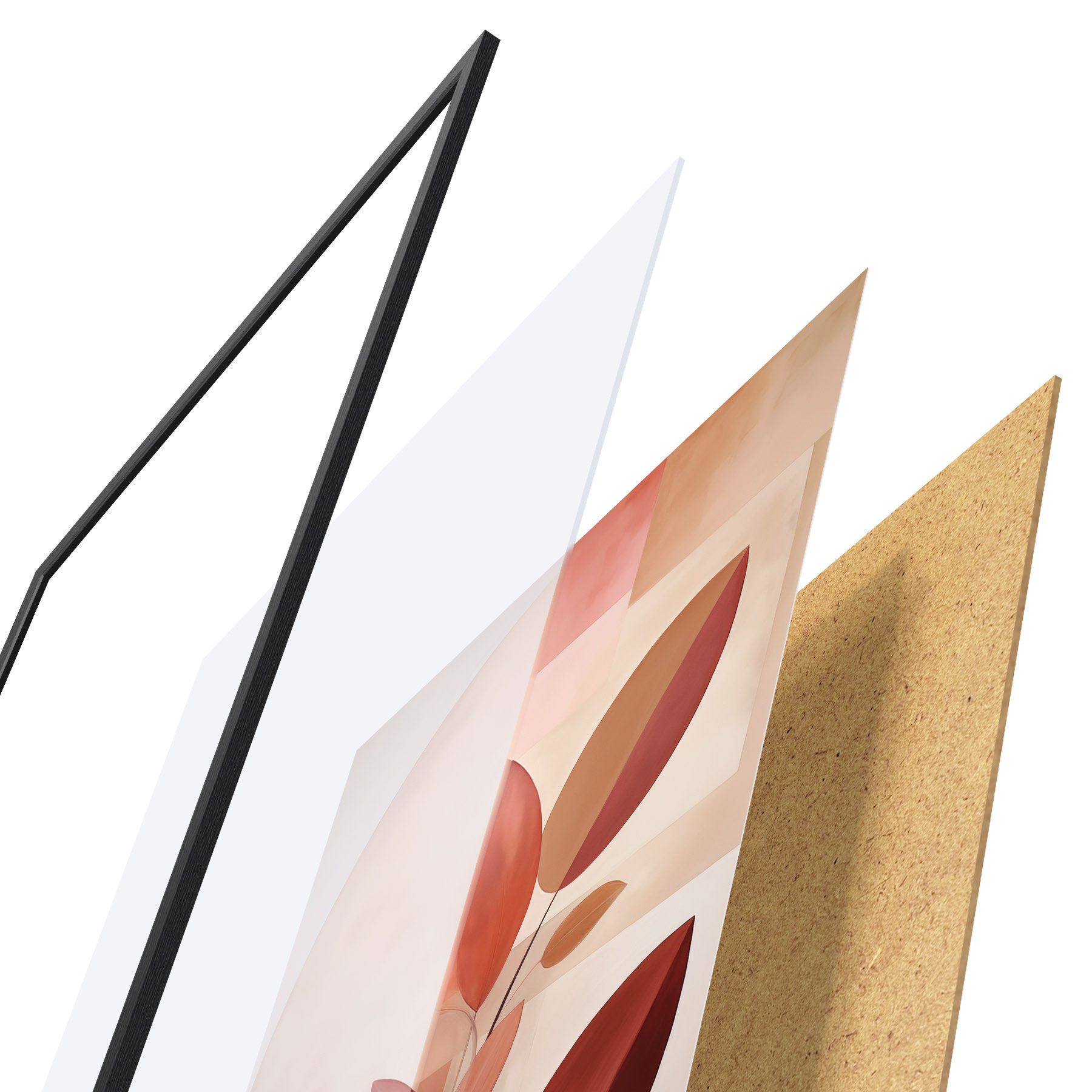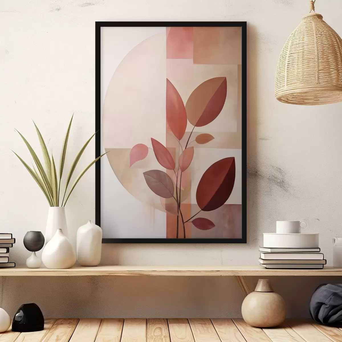 Poster Plantă abstractă cu frunze roșii pe un fundal de forme geometrice și culori delicate, discrete Nr f47041