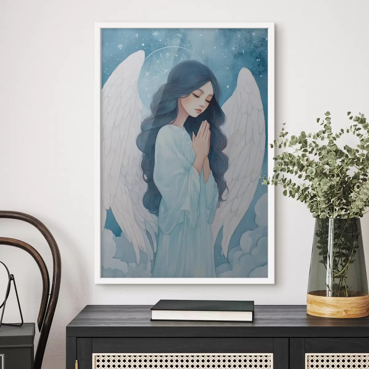 Poster Ilustrație fermecătoare a unui înger printre nori, într-o paletă de culori alb și albastru Nr f47095