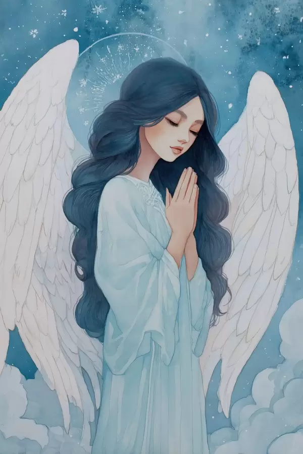 Poster Ilustrație fermecătoare a unui înger printre nori, într-o paletă de culori alb și albastru Nr f47095