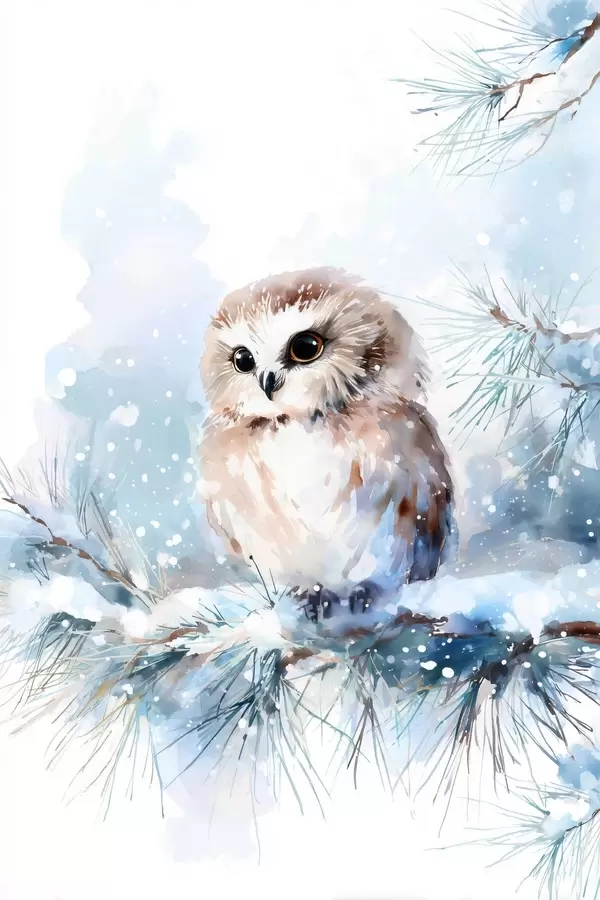 Poster bufniță drăguță pe o ramură de pin acoperită de zăpadă, în stil acuarelă f47115