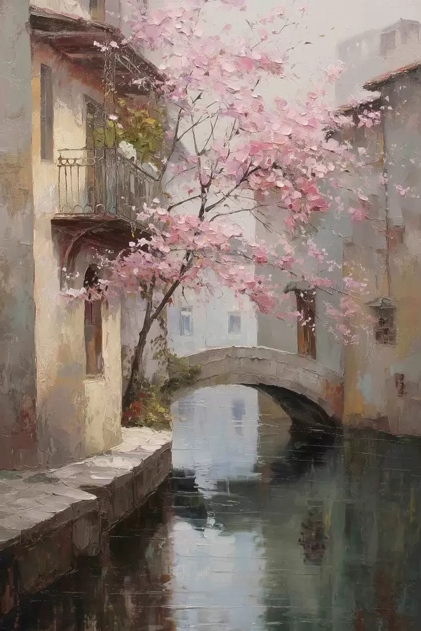 Poster peisaj urban romantic cu un copac înflorit în stilul picturii în ulei Nr f47126