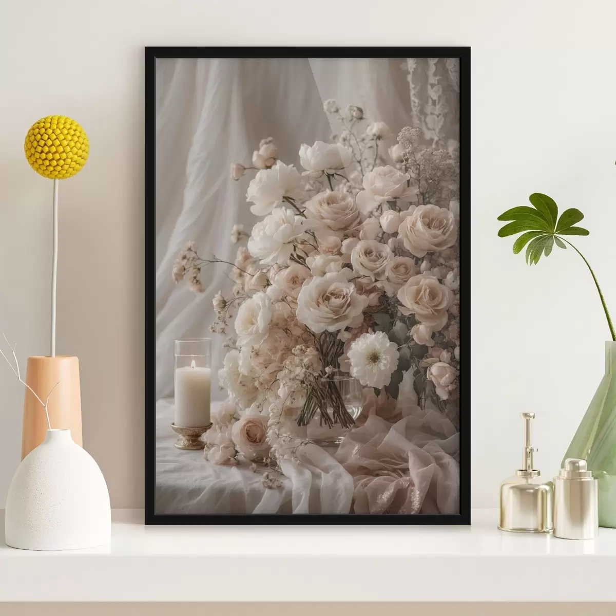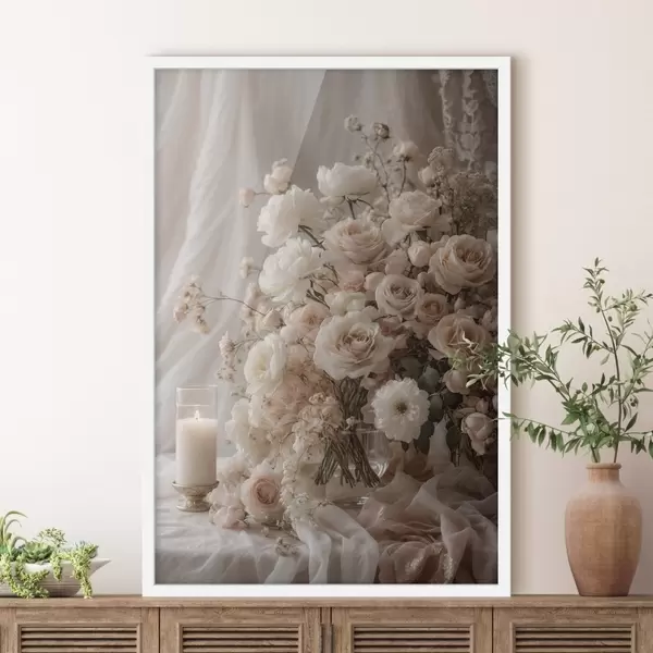 Poster Flori crem lângă o lumânare aprinsă Nr f47281