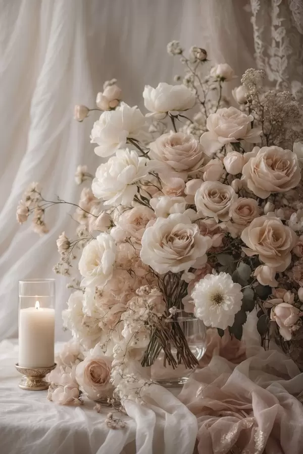 Poster Flori crem lângă o lumânare aprinsă f47281