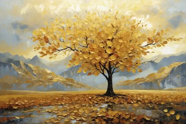 Poster Copac cu frunze galbene într-un peisaj montan Nr f47285