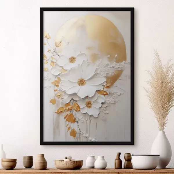 Poster Flori albe cu accente galbene și frunze delicate pe un fundal texturat, artă modernă f47414
