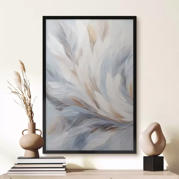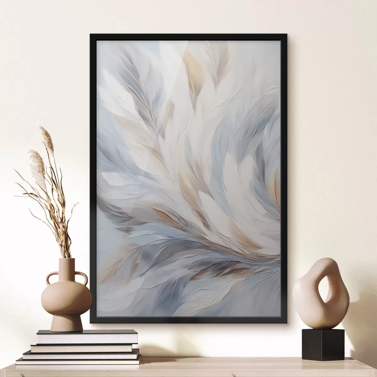 Poster Pictură abstractă cu pene în nuanțe de alb, albastru și maro, cu o textură moale, fluidă și un fundal deschis. Nr f47417