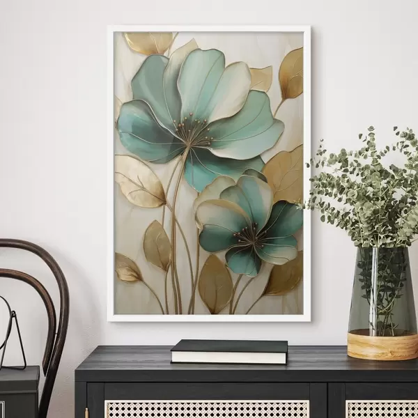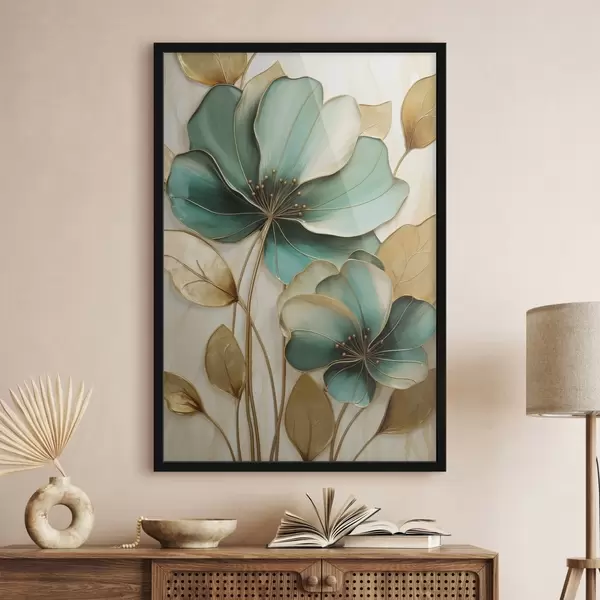 Poster Flori mari de culoare verde-albăstrui și galben, cu contururi, înconjurate de frunze galbene pe un fundal abstract f47418