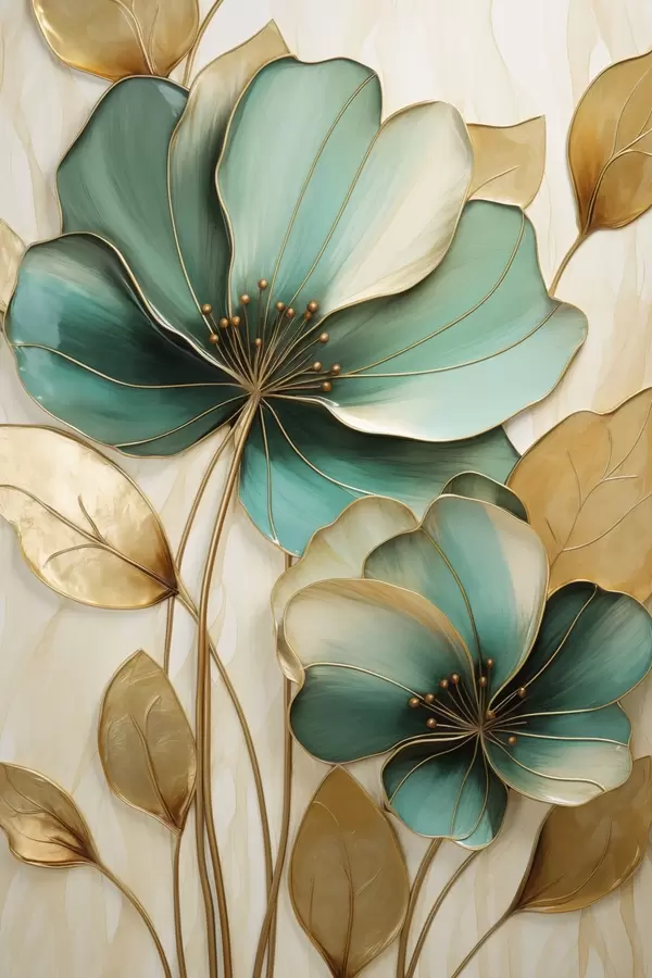 Poster Flori mari de culoare verde-albăstrui și galben, cu contururi, înconjurate de frunze galbene pe un fundal abstract Nr f47418