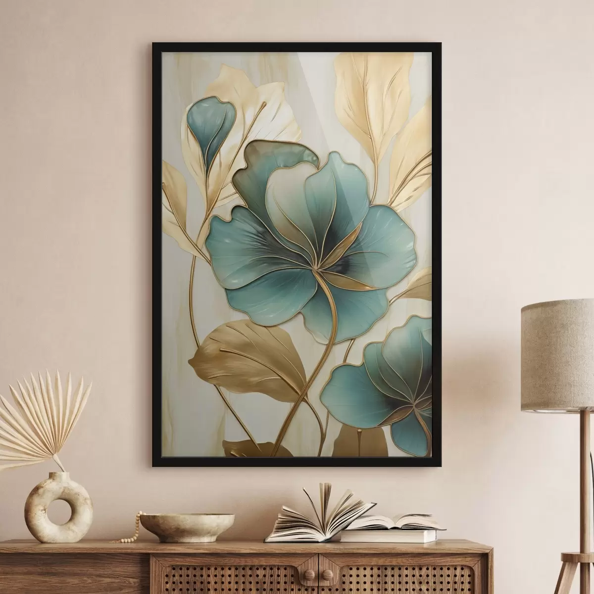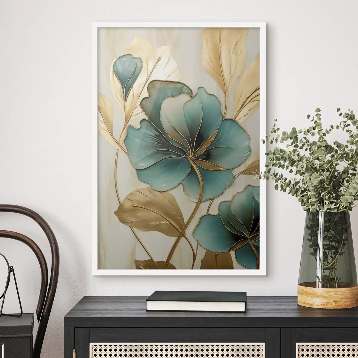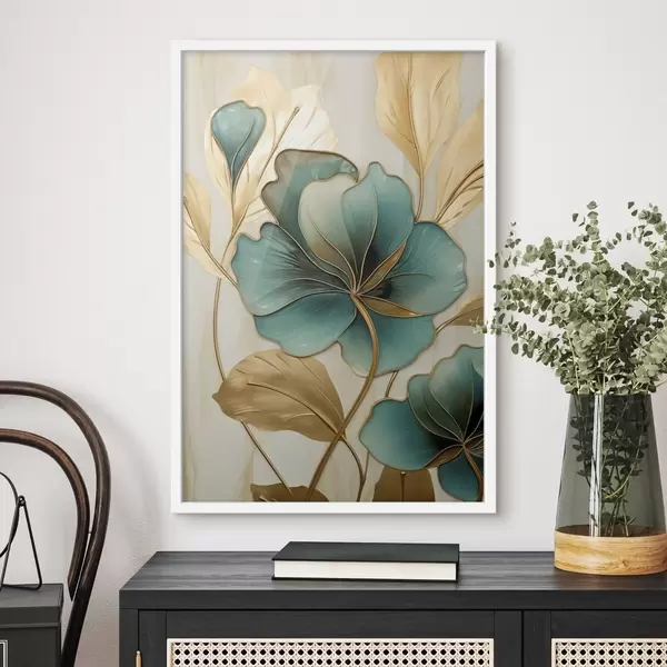 Poster Flori mari de culoare verde-albăstrui și galben, cu contururi, înconjurate de frunze galbene pe un fundal abstract Nr f47419