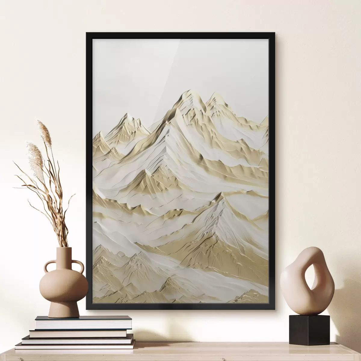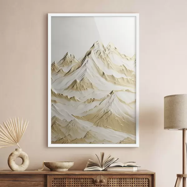 Poster Un peisaj cu munți galbeni, acoperiți de zăpadă, cu vârfuri ascuțite și văi adânci sub un cer luminos. Nr f47420