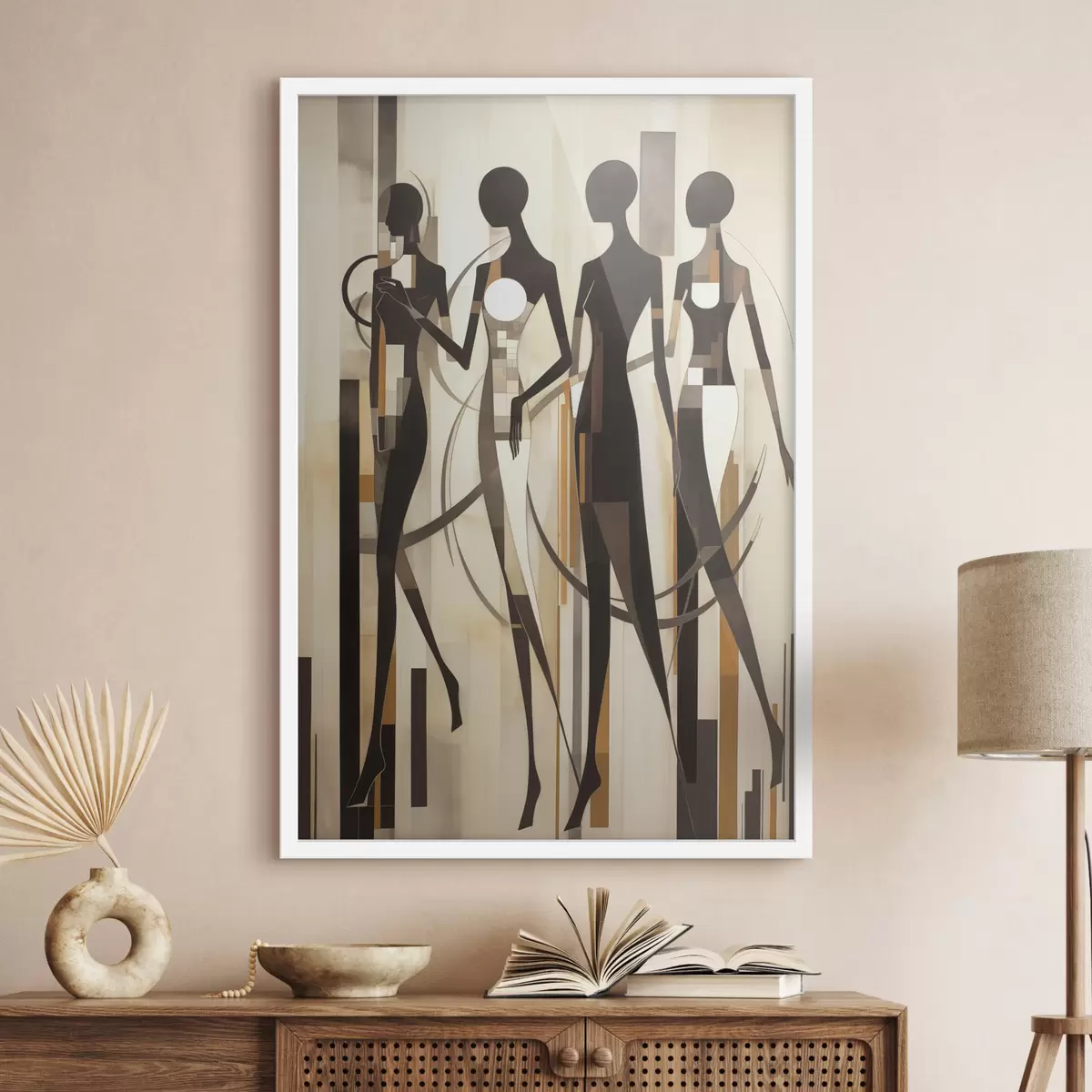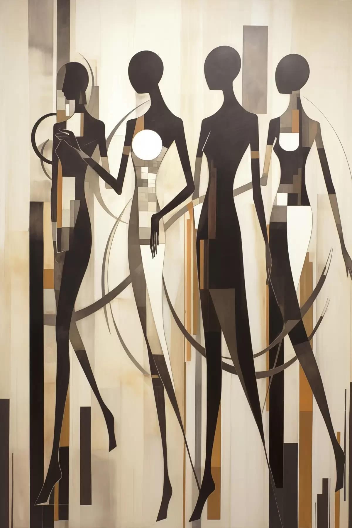 Poster Figuri feminine stilizate cu elemente geometrice pe un fundal abstract de linii verticale Nr f47423
