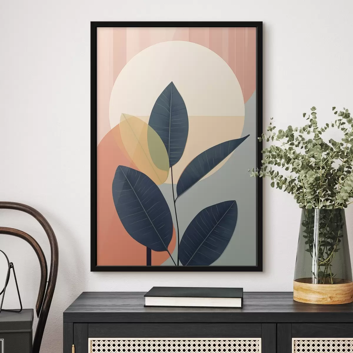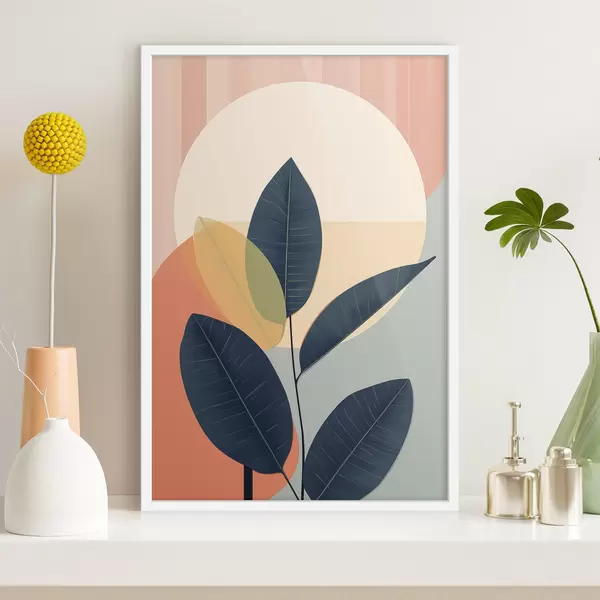 Poster Frunze întunecate pe un fundal de forme abstracte în nuanțe de piersic și gri, cu un cerc mare, de culoare galben pal Nr f47424