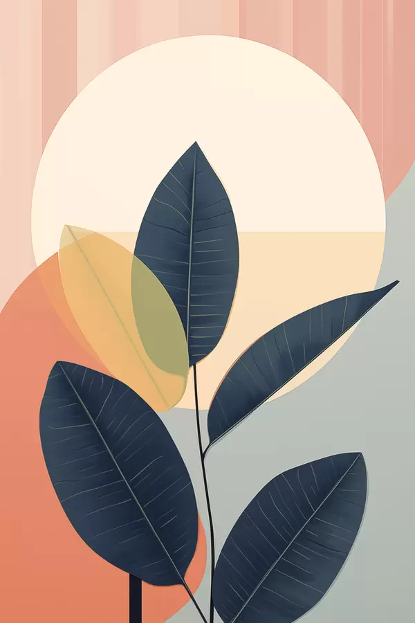Poster Frunze întunecate pe un fundal de forme abstracte în nuanțe de piersic și gri, cu un cerc mare, de culoare galben pal Nr f47424