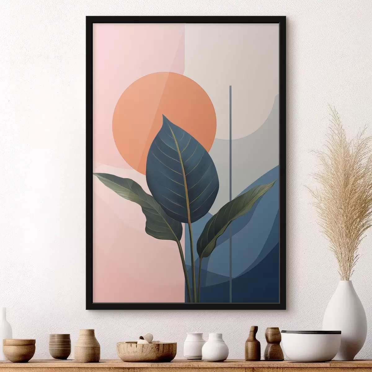 Poster Frunze întunecate pe un fundal de forme abstracte în culori piersic și gri, cu cerc portocaliu Nr f47425