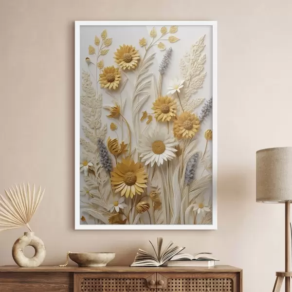 Poster O colecție texturată de margarete galbene și albe cu ierburi uscate și crenguțe de lavandă pe un fundal alb Nr f47430