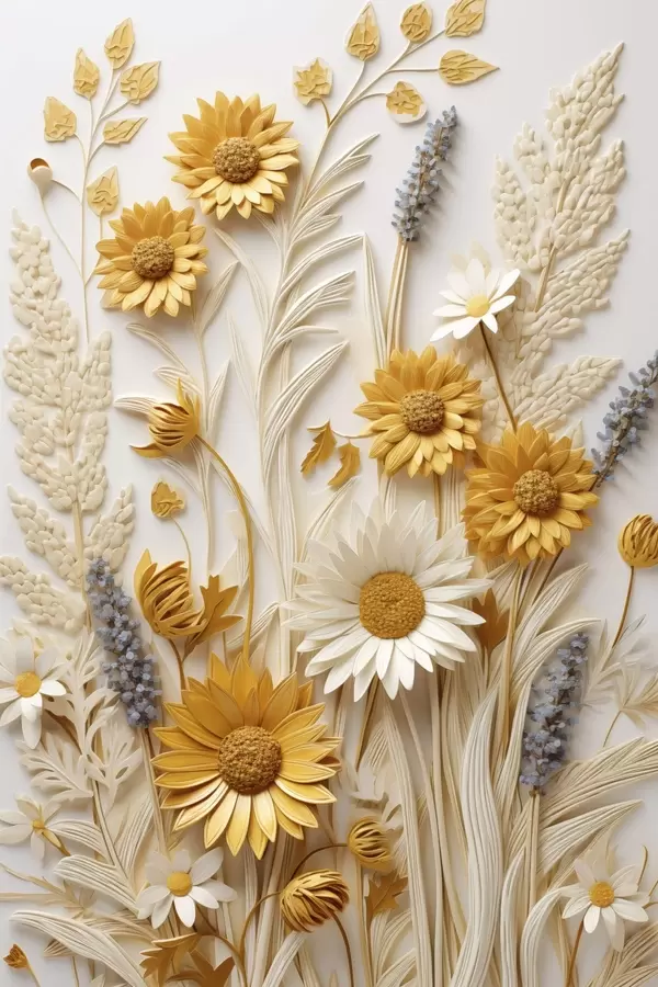 Poster O colecție texturată de margarete galbene și albe cu ierburi uscate și crenguțe de lavandă pe un fundal alb Nr f47430