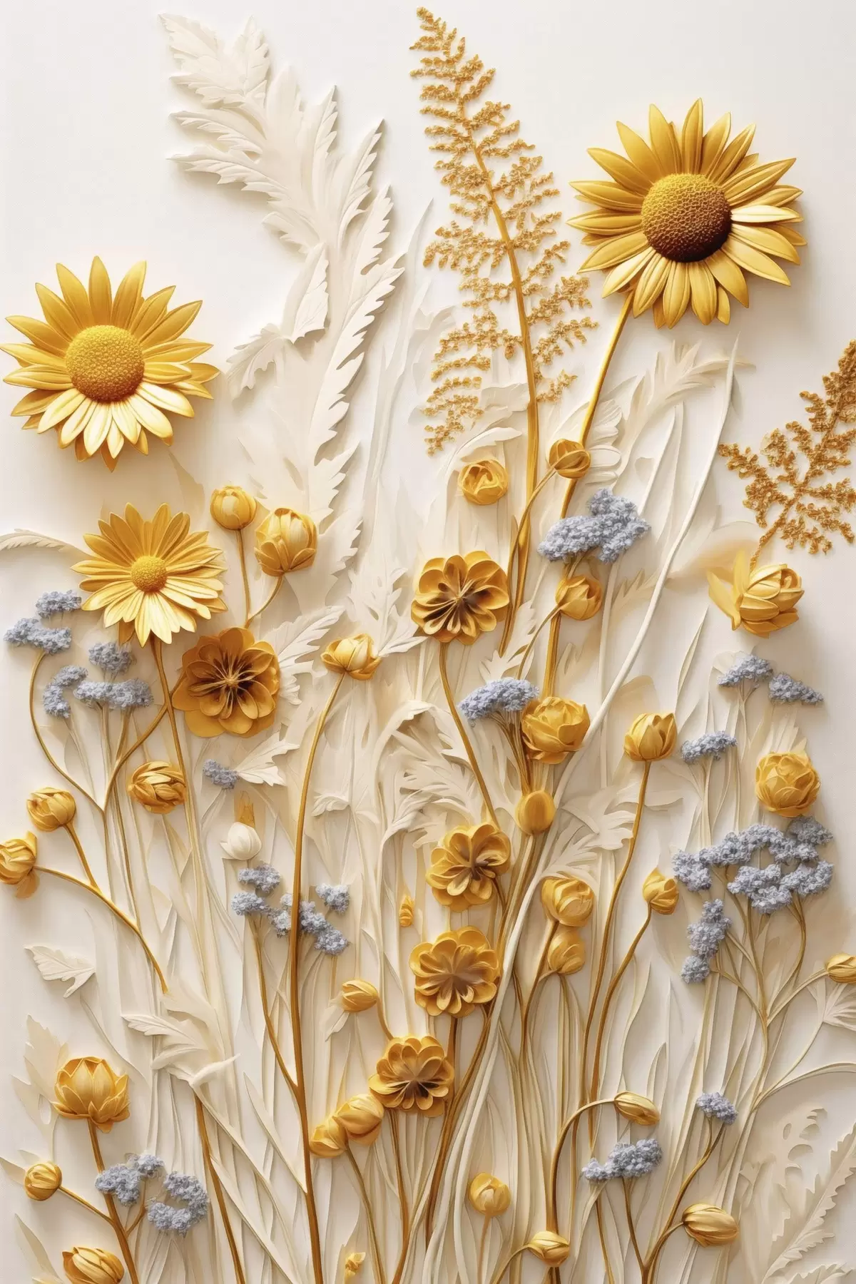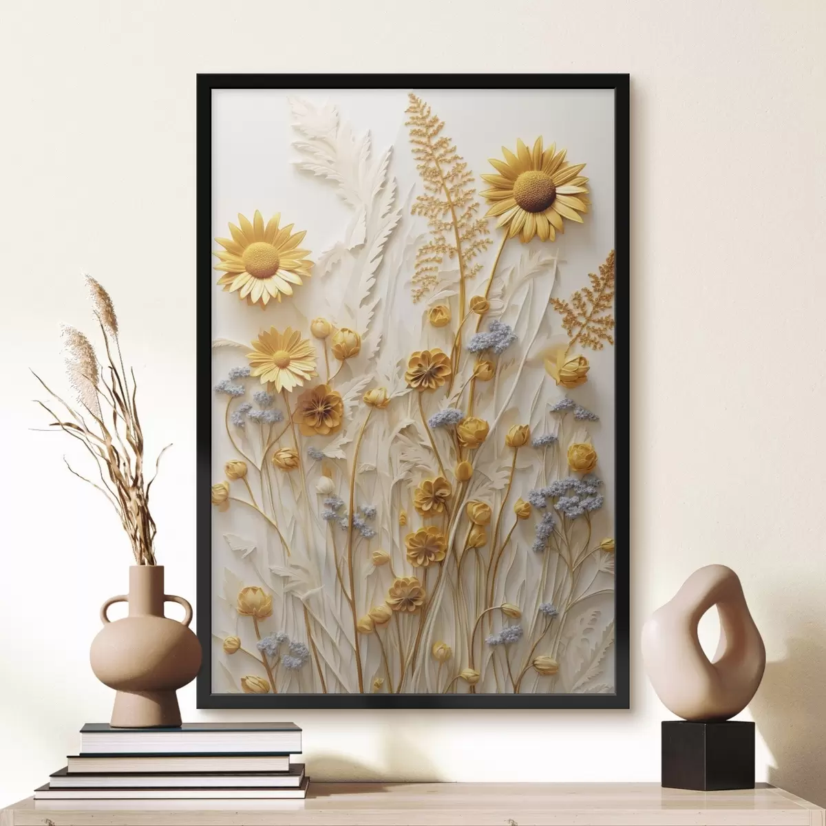 Poster O colecție texturată de margarete galbene și albe cu ierburi uscate și crenguțe de lavandă pe un fundal alb Nr f47431