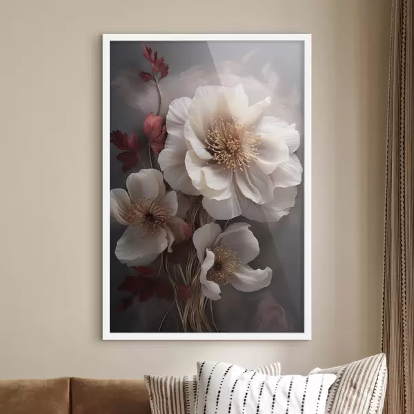 Poster Bujori delicați, cu petale subțiri și vaporoase, înconjurați de frunze roșii închise, pe un fundal abstract f47434